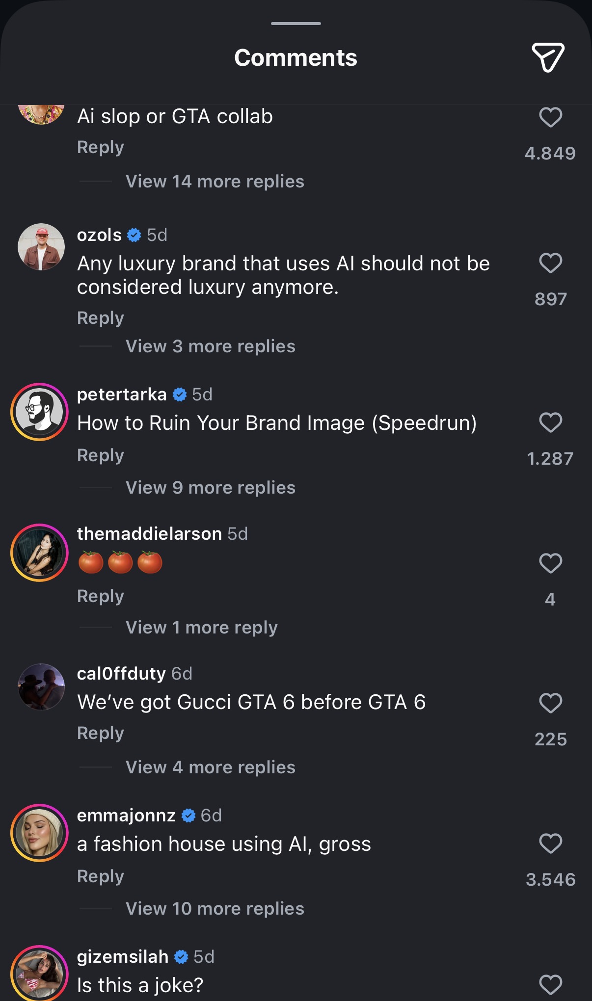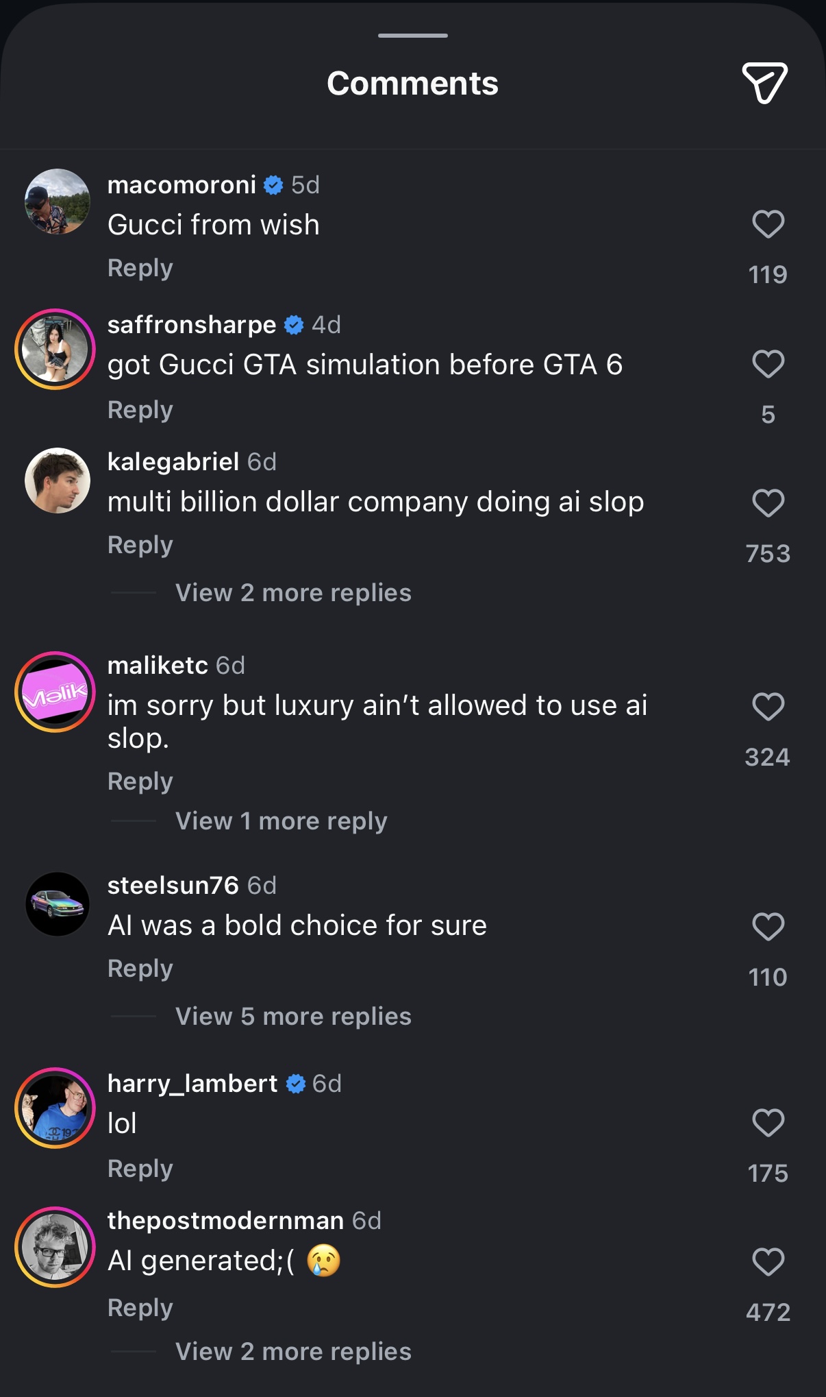 Publicul a reacționat visceral. Oamenii nu vor să vadă figuri generate de un prompt; vor să vadă textura materialului și micile defecte ale modelelor, care ne reamintesc că și ei sunt oameni. Când un brand de renume ca Gucci folosește scurtătura algoritmilor, mesajul e clar: „Nu ne mai pasă de artă” (în ciuda etichetei cu preț de patru cifre).