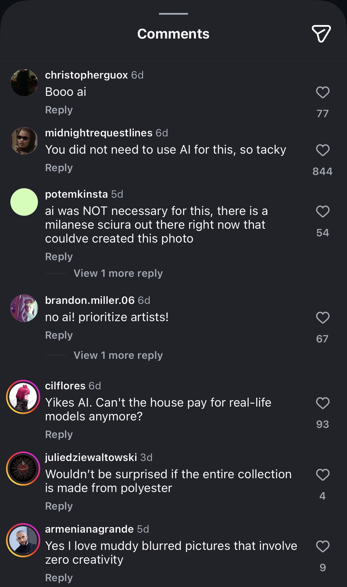 Tăiem aripile tinerilor și avem grijă să le furăm și creativitatea. Eficiența primează în fața viziunii. Dacă marile case aleg calea ușoară, ce pretenții să mai avem de la fast-fashion? Vom ajunge într-un viitor în care întreaga cultură vizuală este un loop infinit de imagini generate automat. IA-ul nu este vreun vizionar; este doar o mașinărie care se antrenează pe truda altor oameni.