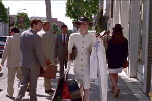 Trecând la Pretty Woman (1990), dăm peste clasicul montaj la cumparaturi care a definit standardul de aur pentru acest tip de secvență. Pe ritmul inconfundabil al lui Roy Orbison, filmul devine un instrument de revanșă socială. Cadrele scurte cu sacoșe de lux, pălării extravagante și zâmbetele complice dintre Vivian și vânzătorii care acum i se pleacă creează o stare de euforie pentru spectator. Ritmul muzicii dictează fiecare tăietură, transformând actul de a cumpăra haine într-o coregrafie a puterii financiare. Montajul ritmic accelerează această ascensiune, eliminând orice moment de plictiseală și lăsând loc doar satisfacției de a vedea „rățușca cea urâtă” cum devine lebăda cu card de credit nelimitat. Este momentul în care montajul funcționează ca un motor de dopamină, făcându-ne să simțim triumful personajului.