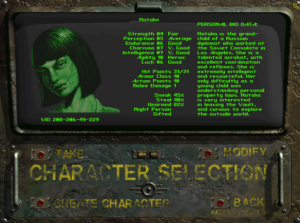 Tu ești unul dintre locuitorii din Vault 13, un adăpost subteran care a rezistat exploziilor nucleare de la suprafață, construit de către Vault-Tec. Sistemul de purificare a apei se defectează și liderul Vault-ului, Overseer-ul, te trimite afară în wasteland să găsești unul nou. Tu ești ori Albert Cole (un individ diplomat și carismatic), ori Natalia Dubrovhsky (o tipă cu pregătire de infiltrare, spion), ori Max Stone (un tip forțos; pumnii lui minte nu are. V-ați prins voi). Deși la prima vedere posibili protagoniști foarte formulaici ai oricărei aventuri fantasy/sci-fi, cu siguranță nimic mai mult decât oameni normali, născuți și crescuți în absoluta siguranță a Vault-ului. Zboară, puiule, zboară, fii action hero!