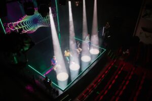 Mahamaya e un mix de întrebări autentice, muzică electronică (nu atât fundal, cât motor) și vizualuri care creează stări. Totul contribuie la senzația că ești prins într-un flux continuu de informație și stimuli. Adică fix ca în viață; doar că fără scroll.